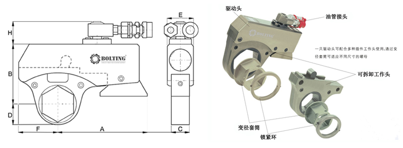 石油防噴器采油樹專用缺口式超薄中空液壓扭矩/扭力/力矩扳手,緊固或拆卸過(guò)程中,無(wú)需反復(fù)取下,一次安裝即可。